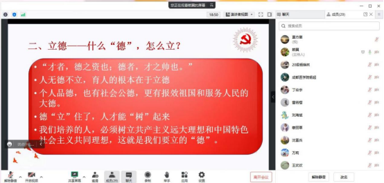 会中,赖翼简要讲解了新中国成立以来德育工作如何演变成育人工作的根本任务,指出教师首要素质就是过硬的师德师风,以“四有”好老师标准强化自身建设,提升教师队伍“立德”和“树人”的能力与水平。同时,她号召支部师生要明大德守公德严私德,自觉同不良思潮作斗争,行为示范争做师生的模范标兵。